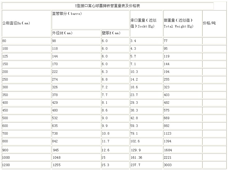 T型接口離心球墨鑄鐵管重量表及價(jià)格表